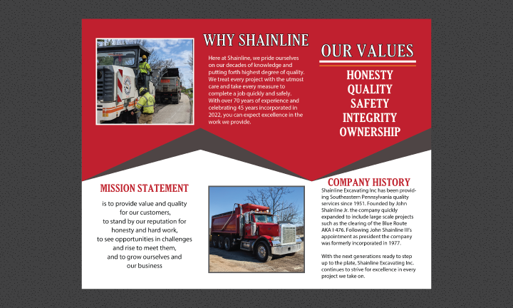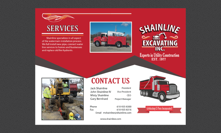 Shainline Excavating Inc is a water main excavation specialist company. With over 60 years of experience, they strive to complete water main related projects such as replacement or repairs in a safe and timely manner. Their former branding did not reflect the look they wanted to maintain. Their work vehicles sport a classical pin stripping design, all uniform in color but unique to each vehicle. That pin stripping and their iconic red and white colors were worked into the new design bringing their brand together in a cohesive look.